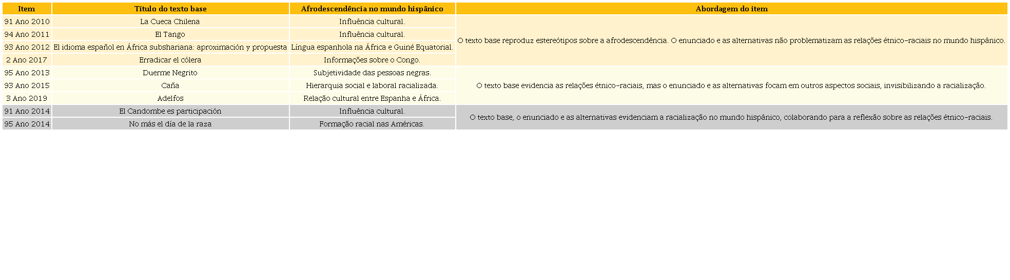Os itens aqui analisados são representativos do corpus estudado. Como foi descrito, a afrodescendência no mundo hispânico, ainda que timidamente, é contemplada no Enem; contudo, a abordagem do tema tende a propor reflexões envoltas às colonialidades.