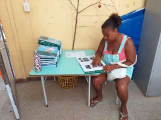 Quase terminando de olhar o documento, surpreendentemente, a senhora que aparece na foto voltou para o início e, nas primeiras páginas, começou a fazer a leitura do que estava descrito. A professora, então, questionou à mãe por que ela decidiu fazer a leitura, e ela lhe respondeu que queria saber, de maneira mais aprofundada, como aconteceu o trabalho, pois as imagens chamaram sua atenção, e ela também percebeu que a sua filha havia mudado um pouco em relação à sua estética. Segundo o relato da mãe, a criança não estava aceitando que as pessoas dissessem que seu cabelo estava despenteado, que precisava ser penteado ou preso com adereços, como presilhas para conter os fios. O argumento da criança, direcionado às pessoas adultas que desejavam prender o seu cabelo, era que ele crescia para cima. Segundo a mãe, a menina, quando questionada sobre tal afirmação, dizia que havia visto na história Princesas negras4, contada pela professora, que o cabelo dela era lindo. A mãe disse que nunca tinha visto a menina tão empolgada com sua própria beleza.