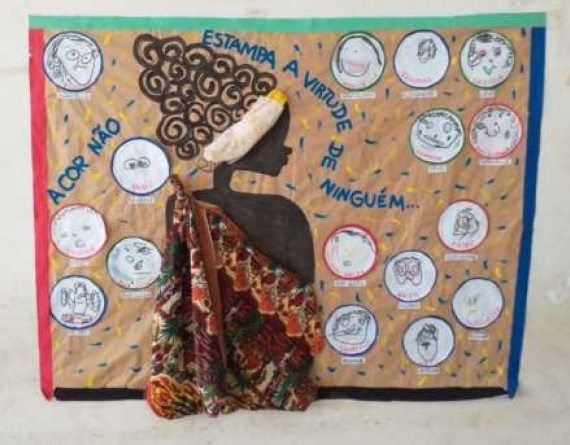 Em novembro de 2019, a professora estava há uma semana sem ir à escola. Quando retornou à atividade laboral, a Auxiliar do Desenvolvimento Infantil (ADI) lhe informou que o referido aluno, ao passar pela imagem-cartaz-decoração, disse-lhe que aquela mulher parecia com a professora dele. A ADI o indagou por que ele achava parecida com a professora, e a criança respondeu que ela era bonitinha5 igual a professora. Nessa perspectiva, o corpo da professora interpela a construção do que a criança percebe como belo. O corpo da professora, então, tem uma função de transmissão de beleza que não está performatizada no cotidiano brasileiro como belo. Assim, o aluno ter contato com o corpo e a performance negra da professora proporcionou ao menino o acesso a outro mundo estético, provavelmente não encontrado na sua família, socialmente considerada branca, tampouco nos desenhos animados apresentados na/em TV aberta.