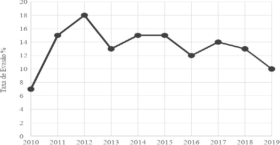 Tais fenômenos associados à ausência de políticas efetivas podem gerar o aumento significativo da evasão. A evasão é o ato de abandonar o curso, não chegando à sua conclusão. Geralmente, ela é caracterizada pela expressão formal do desejo de desistência do curso, via requerimento ou simplesmente pelo abandono. Os dados de evasão geral da UTFPR, campus Pato Branco, para os anos de 2010 a 2019 (Gráfico 1), mostram que, na verdade, a evasão diminuiu em relação ao ano de 2012, no qual a taxa foi de 18%, a mais alta do período apresentado.