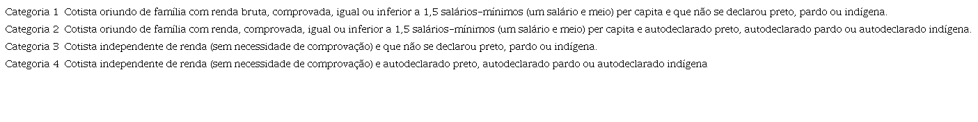 De acordo com o Edital, os cotistas foram distribuídos em quatro categorias (Quadro 1) que atendiam o aspecto socioeconômico (renda) e consideravam se o estudante era egresso de escola pública além da autodeclaração de raça.