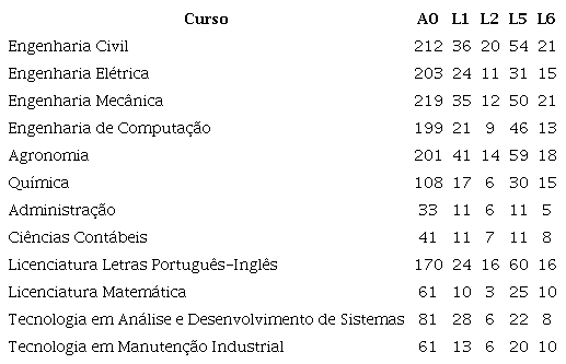 A partir dos dados demonstrados no Quadro 6 e considerando que o ingresso é de 88 alunos por ano, ou de 26 alunos por ano, no caso dos cursos de Tecnologia, e que a duração dos cursos é de cinco anos nas Engenharias e na Agronomia, três anos nas Tecnologias e quatro anos nos demais cursos, verificamos que, na UTFPR, campus de Pato Branco, existem mais estudantes não cotistas do que cotistas matriculados no ano de 2021, conforme mostra o Quadro 6: A0 (ampla concorrência): 1.588 estudantes; L1 (baixa renda e escola pública): 271 estudantes; L2 (autodeclarado, baixa renda, escola pública): 116 estudantes; L5 (escola pública): 419; e L6 (autodeclarado, escola pública): 160 (UTFPR, 2021a).