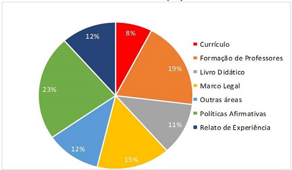 A categoria denominada “Políticas de ação afirmativa” abarca discussões sobre políticas de identidade dentro de contextos educacionais. Vale alertarmos sobre as problemáticas advindas da falta de políticas de permanência, a importância da adoção destas e a avaliação do desempenho de políticas já instauradas como, por exemplo, as cotas no ensino. Já a “Formação de professores” é a categoria que apresenta discussões frente à necessidade de melhor estruturação perante o tema das relações étnico-raciais, a dificuldade dos docentes em incorporar a temática em suas disciplinas bem como em incorporá-la ao aprendizado dos alunos. É perceptível a insatisfação com a própria formação docente, a qual não fornece subsídios aos professores para atuarem com segurança frente às relações étnico-raciais.