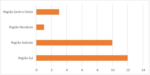 Os periódicos encontram-se distribuídos em todas as regiões brasileiras (Sudeste, Nordeste, Centro-Oeste e Sul), com exceção da região Norte, conforme indica o Gráfico 4. A maior incidência de produções foi encontrada nas regiões Sudeste e Sul; já as regiões Centro-Oeste e Nordeste apresentaram um índice mais baixo.