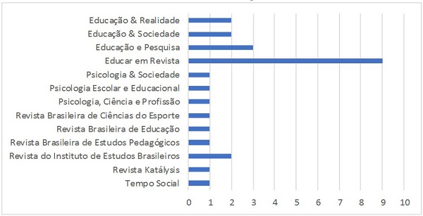 Podemos analisar que os periódicos que mais apresentam produções na temática das relações étnico-raciais são: Educar em Revista, da Universidade Federal do Paraná (UFPR), com nove trabalhos; Revista Educação e Pesquisa, da Universidade de São Paulo (USP), apresentando três trabalhos; e Educação & Realidade, da Universidade Federal do Rio Grande do Sul (UFRGS), Educação & Sociedade, da Universidade de Campinas (Unicamp), e Revista do Instituto de Estudos Brasileiros, também da USP, com duas produções cada. As demais revistas apresentaram apenas um trabalho cada. Essa distribuição encontra-se no Gráfico 5.