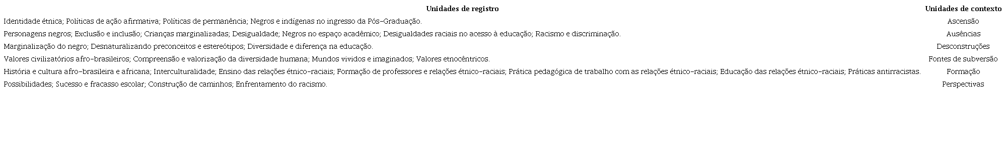 A categoria “Desconstruções” está relacionada a um esforço intenso voltado ao esvaziamento das fontes de preconceitos e de marginalização. Segundo Silva (1995), existe uma estratégia educacional muito bem arquitetada, pautada no racismo, que propõe a eliminação do negro, retirando sua imagem de cena na grande maioria das vezes e, em alguns momentos, apontando para uma certa evidência, porém de maneira marginalizada.