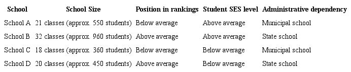 The selection of schools is based on data from the 2015 school census (INEP database) and two main discriminatory variables: student socio-economic status (Indicador de Nível Socioeconômico- INSE) and Prova Brasil test results. By dividing the variables into two categories (above and below average), the final sample generated four ideal school types: poor schools performing well, poor schools performing badly, well-off schools performing well and well-off schools performing badly. Four schools were selected, one per category and the final number of schools included two state and two municipal schools. The characteristics of the participating schools are presented below: