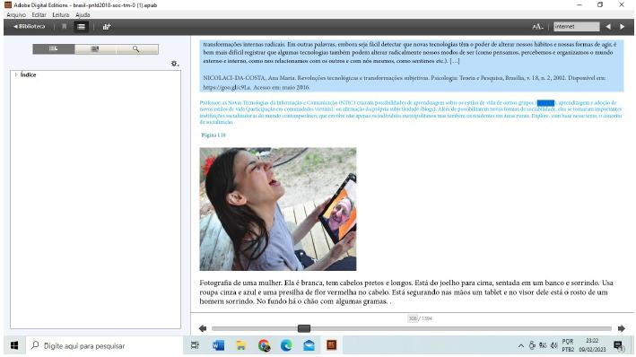Apesar de os livros didáticos no Brasil operarem em ciclos trienais, os livros analisados abasteceram os estudantes no país no quadriênio 2018-2021, protelado por mais um ano pelo MEC, justificando, assim, a adaptação ao novo Ensino Médio implementado em 2022. O suporte utilizado na pesquisa é o ePUB,4 disponibilizado pelo Fundo Nacional de Desenvolvimento da Educação (FNDE).