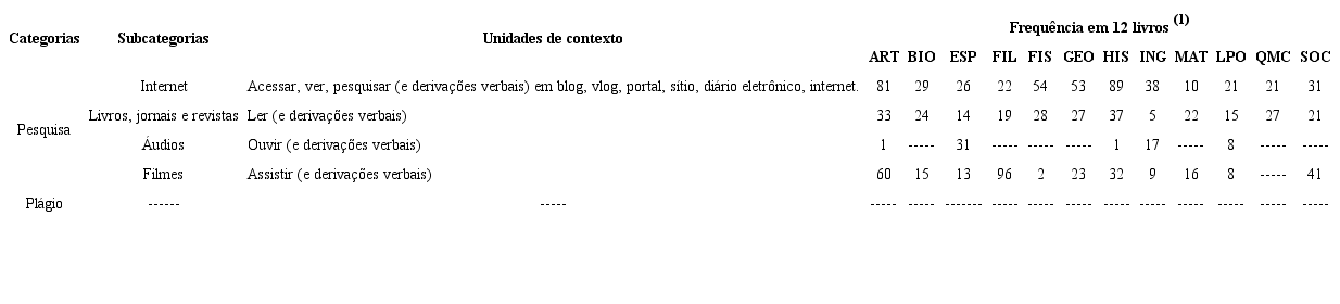 A Tabela 1, elaborada nesta pesquisa, segue as diretrizes de Bardin (2011) e aborda, de forma frequencial, o conteúdo encontrado em cada livro e no referido Edital com pertinência temática à questão da pesquisa e do plágio. Portanto, as indicações de sites são ainda maiores, mas não se correlacionam com a categoria e respectiva subcategoria na análise temático-categorial indicadas por Bardin (2011), pois, nessa proposta, seguindo o rigor metodológico, excluímos descritores textuais, referências bibliográficas relacionadas a sites, filmes, áudios, imagens e textos. Há, no total, 475 indicações de pesquisas na internet; contudo, após análise atenta - item por item -, em dois formatos de e-books diferentes (ePUB e PDF), averiguamos que, em nenhum material analisado, há quaisquer menções ao plágio e, em apenas três obras, localizamos cuidados que os estudantes devem tomar nas pesquisas que realizam na internet para não copiar e colar sem mencionar a fonte. No entanto, nesse caso, não se menciona o termo “plágio”.