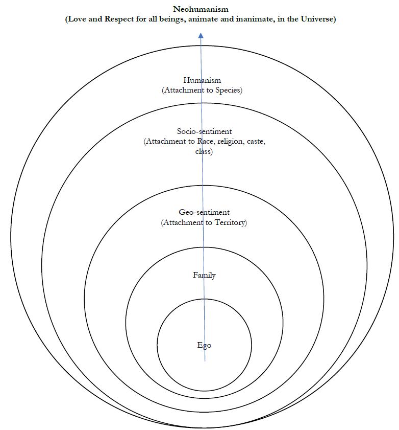 It is yearning, the ‘eternal desire’, that drives this quest. This can be understood, as in Image 1, as a Neohumanist arrow moving each of us from the entrapment of ego, through a range of sentiments for family, territory and social group to attachment to species and then into the Neohumanist realm of expanded being.