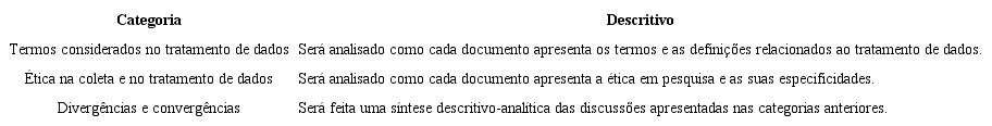 No entanto, nas entrelinhas da jurisprudência nacional, surgiu a Lei Nº 13.709/2018 (BRASIL, 2018), a LGPD, com foco geral no tratamento de dados em todo o território nacional. Diversamente às duas Resoluções, a saber, Nº 466/2012 e Nº 510/2016, a LGPD opera e organiza-se pelo viés burocrático, legalista e positivista. Desse modo, a sua natureza é jurídica e não eminentemente ética enquanto possibilidade de formação ou de reflexão sobre os dilemas que envolvem os conceitos de liberdade e privacidade. Perante isso, é perceptível que há grandes divergências e convergências que emergem dessas normativas, uma vez que estão intrinsecamente vinculadas ao cenário de ética na coleta e no tratamento de dados no país. Por isso, para que se possa analisar tais convergências e divergências, elegeram-se as categorias analíticas que são apresentadas com detalhe no Quadro 2.