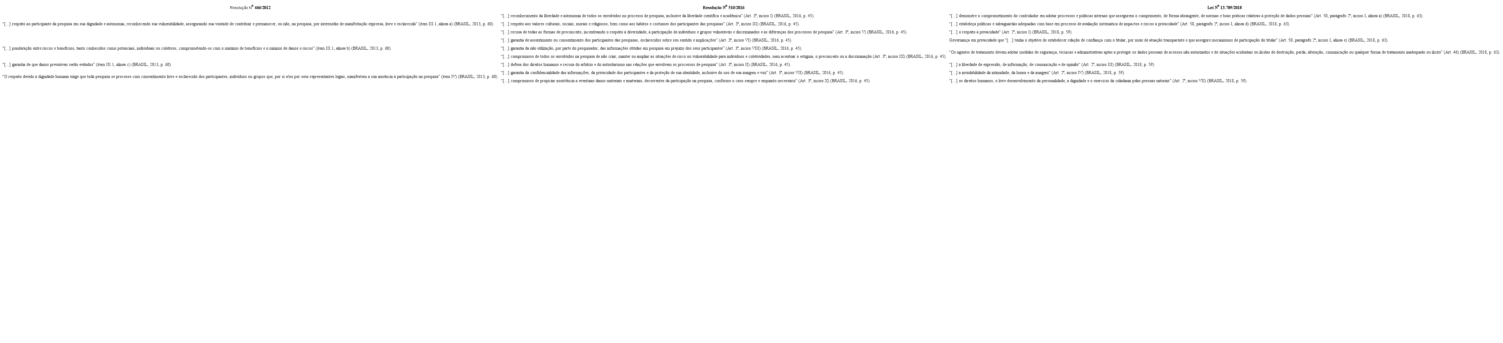 Um elemento comum entre as Resoluções e a LGPD é a defesa dos Direitos Humanos como condição para validar os processos de investigação e de garantia protetiva aos participantes da pesquisa. Nos documentos, é expressa a preocupação com a segurança da dignidade, no entanto, na LGPD, a ênfase na proteção à privacidade, enquanto na Resolução No 466/2012 e na Resolução No 510/2016 as garantias aos sujeitos participantes da pesquisa se expande para a proteção da autonomia e da liberdade. Outro elemento convergente nos documentos é a preocupação com a confiabilidade e as garantias de anonimato.