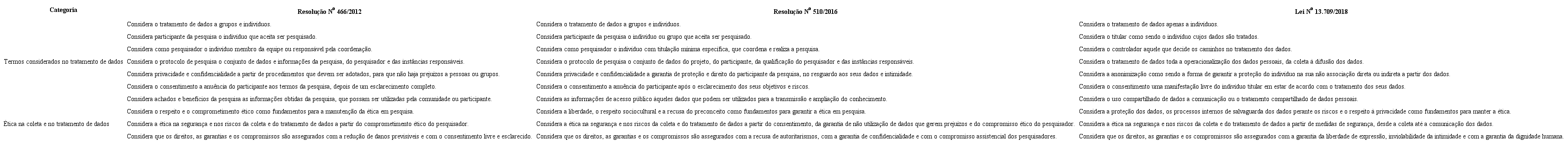 Nessa categoria, são apresentadas as discussões e os resultados relativos às dimensões éticas que são apresentadas nos documentos, da coleta ao tratamento dos dados, sobretudo na relação de respeito e moralidade dos indivíduos. Para sua sistematização, o Quadro 4 apresenta uma síntese descritiva em comparativo.