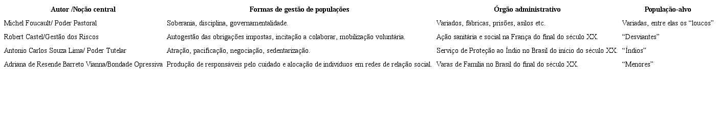 Esse fenômeno não acontece apenas com serviços de saúde. Anteriormente, reuni diferentes modalidades de gestão de populações tuteláveis, destacando como um dos órgãos o próprio Serviço de Proteção ao Índio (SPI) (Quadro 1).