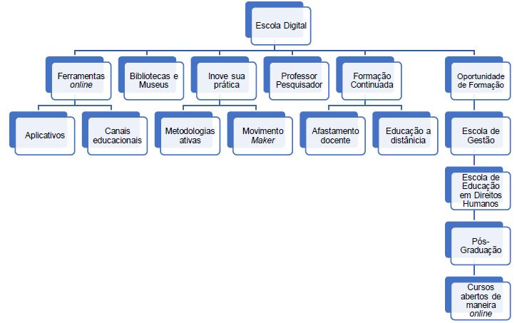 Analisando todos os elementos que constituem a Escola Digital do Professor6, fica clara a inserção de temáticas do ambiente coorporativo e empresarial na escola. O conteúdo se divide em momentos individuais de formação docente, em especial nos que versam sobre práticas inovadoras em sala de aula, e materiais estritamente deliberativos, para momentos coletivos de formação. As temáticas que versam sobre integração de ferramentas digitais no contexto escolar são incentivadas, sem estabelecer relação com a realidade estrutural e física dos colégios e a possibilidade de adequação e realização das propostas pelos professores. Assemelha-se a um ideal educacional apontado por organizações empresariais, em consonância com a retórica da formação continuada como ferramenta da qualidade na educação.