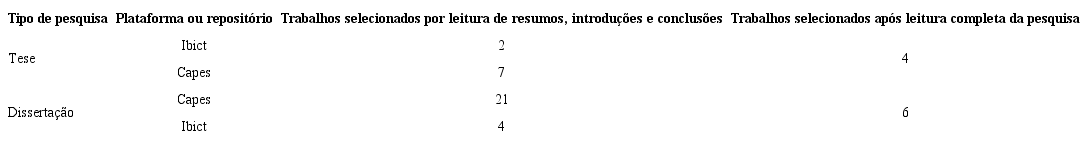 Antes de tudo, foi realizada uma revisão de literatura no início do ano de 2020, por meio dos descritores: formação continuada e desenvolvimento profissional docente, na plataforma da Coordenação de Aperfeiçoamento de Pessoal de Nível Superior (Capes) e no Instituto Brasileiro de Informação em Ciência e Tecnologia (Ibict). A pesquisa levou inicialmente a 8.934 teses e dissertações nas duas plataformas. Com base nesse quantitativo, foi utilizado o recurso de filtros de pesquisa, circunscrevendo os achados apenas a pesquisas desenvolvidas entre os anos de 2013 e 2019, tendo em vista que os textos anteriores a 2012 não estão disponíveis. Foram selecionadas pesquisas exclusivamente à área de avaliação, conhecimento e concentração correlatas à educação. Com isso, reduziu-se a análise a 1.482 documentos na plataforma da Capes. Compararam-se os documentos selecionados aos achados no Ibict, tendo em vista que havia teses e dissertações que constavam nas duas plataformas. Realizou-se a leitura de títulos, resumos, introdução e conclusão de todos os trabalhos em busca de identificar pesquisas que relacionavam a formação continuada ao desenvolvimento profissional docente. A Tabela 1 traz o quantitativo encontrado em cada plataforma.