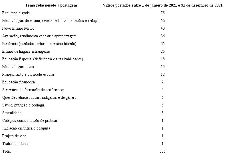 No ano de 2021, foram postados 335 vídeos no Canal do Professor - Formação Continuada SEED-PR. Percebe-se que o momento pandêmico potencializou a utilização do canal, veiculação de material e enfoque na capacitação dos docentes acerca do uso de recursos didáticos digitais, desde o uso da plataforma Google Meet, postagem em redes sociais, montagem de conteúdos digitais, inovação, jogos e robótica, associados à prática pedagógica. Por sua vez, os aspectos metodológicos e os temas considerados pertinentes à Educação Básica foram intensamente postados, remetendo à divulgação de modelos didáticos padronizados, assim como de estratégias para a otimização de resultados em avaliações externas. A implementação do Novo Ensino Médio foi, igualmente, foco das formações docentes, conotando a preparação instrumental para tal. O contexto pandêmico foi abordado, desde a preparação para o ensino online, híbrido, alcançando questões que esclareceram os cuidados para o retorno ao modelo presencial de ensino.
