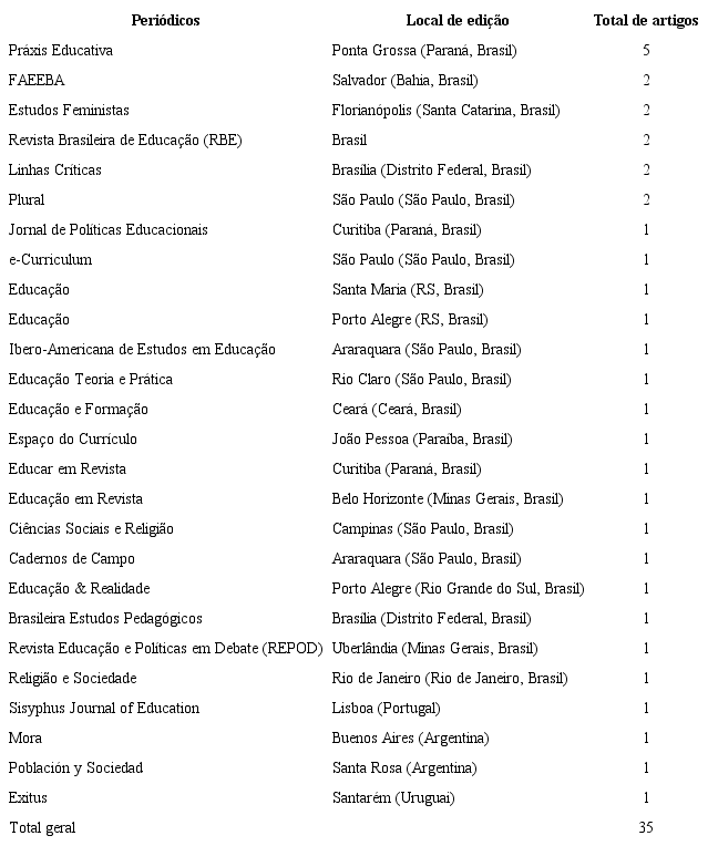 A explicitação das perspectivas teórico-epistemológicas empregadas nas pesquisas e nos estudos científicos quanto ao tema aqui proposto vai, portanto, ao encontro dessas orientações e definições ético-ontoepistemológicas, posto que o material empírico analisado foi extraído dos trabalhos desenvolvidos por Voss (2022a, 2022b). A partir do levantamento feito pela citada autora, o qual reuniu um conjunto de 219 artigos que tratam do tema neoconservadorismo e as políticas educacionais neoconservadoras, publicados em revistas nacionais e internacionais, no período de 2012 a 2022, realizou-se um recorte metodológico para seleção e organização da amostra da pesquisa aqui apresentada sobre a produção científica latino-americana na qual foi identificada a abordagem do tema sexualidade ou temas afins - referentes à gênero, família, religião, moral - relacionados às políticas educacionais neoconservadoras. O que delimitou a composição de uma amostra de 35 artigos. Na Tabela 1, apresenta-se a sistematização da amostra trabalhada no que se refere ao local de edição e ao número de artigos de cada revista usada na pesquisa.