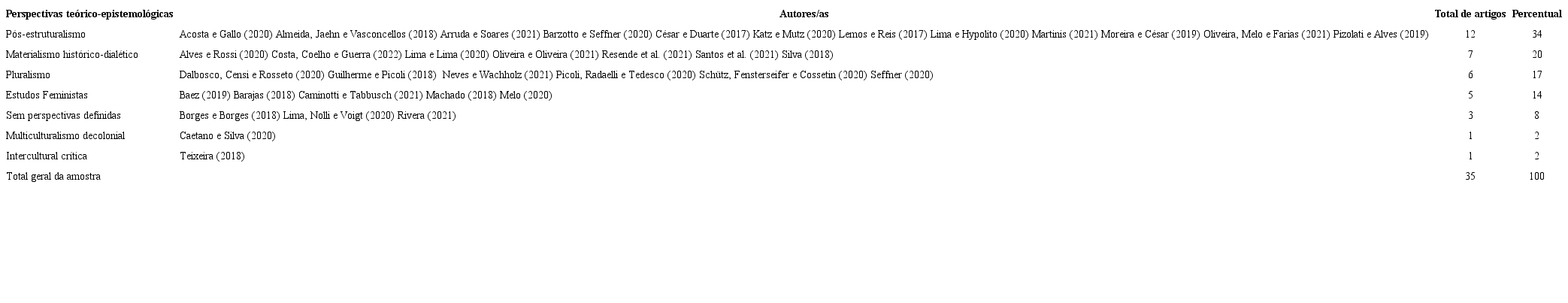 Quanto à identificação e à análise das perspectivas teórico-epistemológicas, levou-se em conta as indicações feitas pelos/as próprios/as autores/as em seus textos e, quando as perspectivas não foram indicadas diretamente, considerou-se o desenvolvimento da discussão, os conceitos trabalhados e o referencial teórico usado por cada autor/a no decorrer do artigo. A análise das perspectivas teórico-epistemológicas se compôs da forma como mostra a Tabela 2.