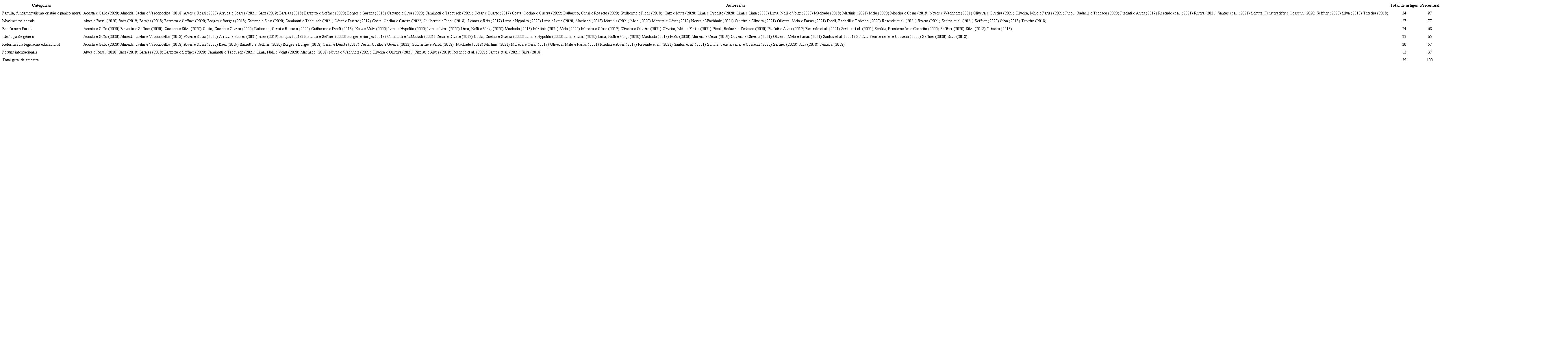 Com relação à análise das abordagens do tema sexualidade, foi possível identificar um conjunto de enunciados comuns nas discursividades latino-americanas presentes nos artigos pesquisados. Essa análise permitiu fazer o cruzamento das abordagens a partir da construção de categorias, assim denominadas: (1) Família, fundamentalismo cristão e pânico moral; (2) Escola sem Partido; (3) Movimentos sociais relativos à defesa da pluralidade de gênero e sexualidade; (4) Reformas na legislação educacional; (5) Fóruns internacionais de produção de políticas de combate às desigualdades de gênero e sexualidade, conforme especificado na Tabela 3.