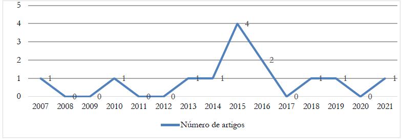 Os trabalhos que tratam da inclusão de estudantes com deficiência visual foram publicados entre 2007 e 2021, demonstrando que o interesse pelo tema não é muito recente. Em 2015, foram publicados um maior número de trabalhos, quatro dissertações, demonstradas no Gráfico 1, a seguir, sobre a distribuição anual dos estudos. Os dois estudos sobre inclusão de estudantes com deficiência visual no Ensino Superior, dentre os 13 trabalhos mapeados, foram publicados em 2013 e 2021, sendo, portanto, um pouco mais recentes.
