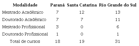 No estado do Paraná, foram encontradas nove instituições que possuem cursos stricto sensu em Educação; em Santa Catarina, 12 Instituições de Ensino Superior (IES) possuem esse tipo de curso; e, no Rio Grande do Sul, 15 universidades possuem cursos stricto sensu em Educação. Na Tabela 1, é possível verificar o quantitativo de cursos de Mestrado e Doutorado por estado.