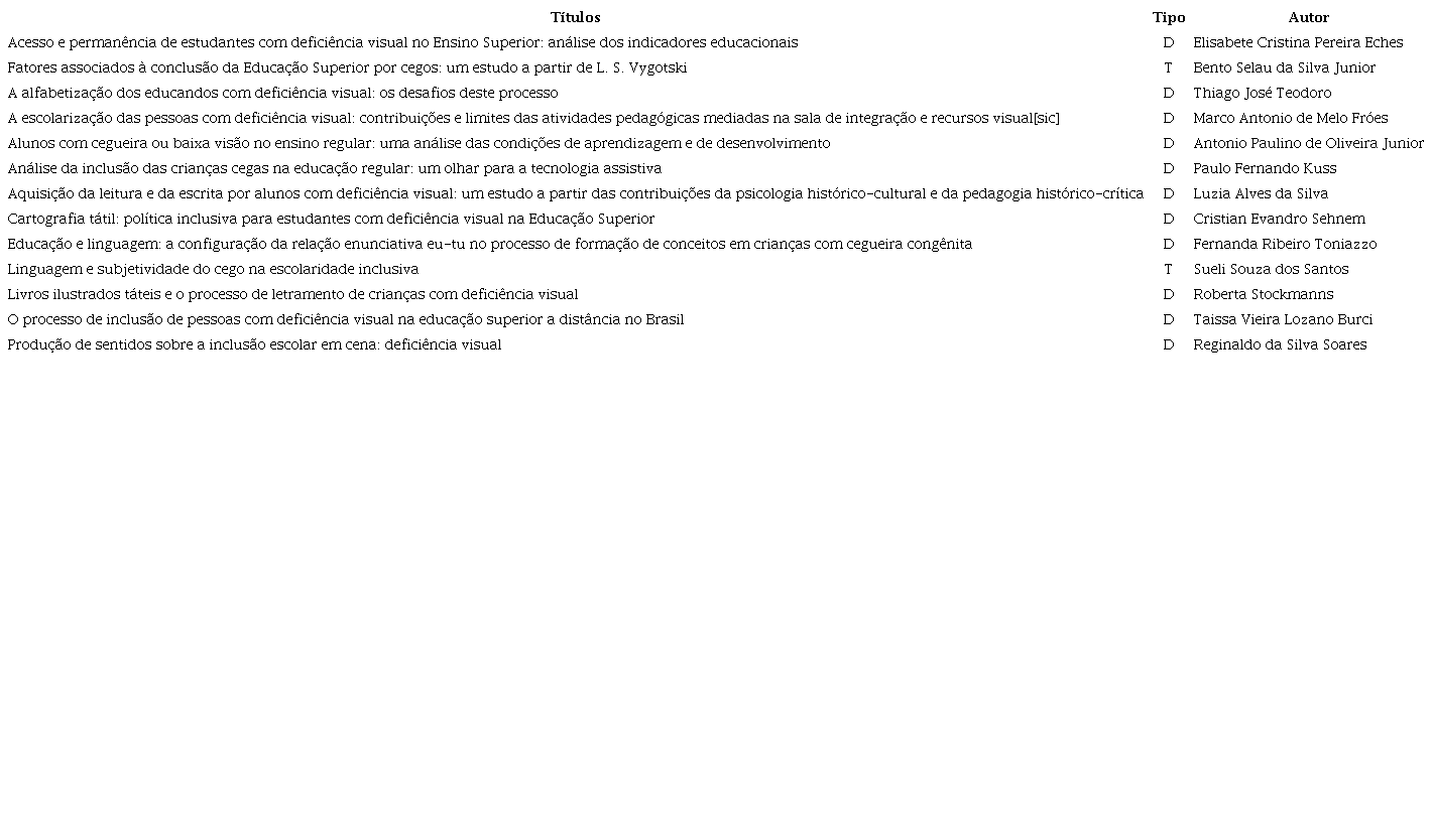 Abstract: This article discusses theses and dissertations that deal with the inclusion of students with visual impairment from South Brazilian research in Education. It aims to describe and analyze the theses and dissertations on the inclusion of visually impaired students of Master’s and Doctoral courses in Education in the South of the country based on the historical materialism. The methodology adopted in this research was the search for theses and dissertations on the pages of the Graduate Study Programs in Education of South Brazilian universities and in their repositories or libraries, through descriptor terms or through the partial or full reading of the texts. The descriptor terms used, in Portuguese were: “cego”, “cega”, “cegueira”, “deficiência visual”, “baixa visão”, “visão subnormal”, “deficiência sensorial”, “braile”, “tátil’ e “audiodescrição” (in English: blind, blindness, visual impairment, low vision, subnormal vision, sensory impairment, braille, tactile and audiodescription). No time period has been set for the searches. The studies found were published between 2007 and 2021, being 11 theses and two dissertations. The research pointed out as main results the lack of accessibility of contents, lack of technological accessibility, lack of teacher training and prejudice against students with visual impairment. The data showed that there is little study interest on the inclusion of visually impaired students. The inclusive process of this public should not present so many difficulties because there are only sensory limitations. However, in a society sustained by inequality, maintaining conditions to meet the specificities of these subjects becomes difficult.