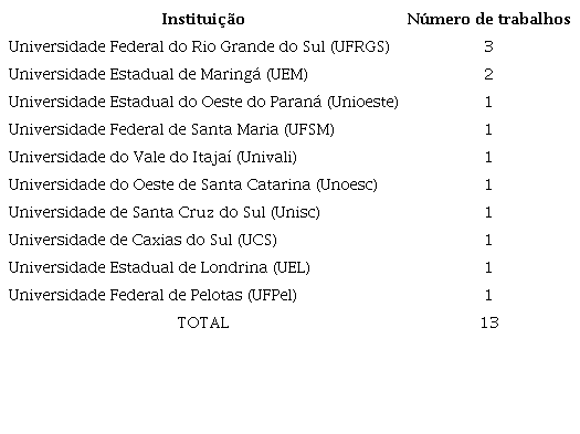 Quanto à localização dos 13 trabalhos, sete são vinculados a cursos do Rio Grande do Sul, dois estão em cursos de Santa Catarina e quatro são de cursos de Mestrado e Doutorado em Educação do estado do Paraná. A Tabela 2, na sequência, demonstra os trabalhos por instituição.