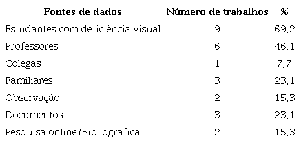 Neste estudo, ficou demonstrado que a maioria das pesquisas teve a participação de estudantes com deficiência visual, o que contribui para uma maior fidedignidade das informações apresentadas. Além disso, alguns estudos utilizaram mais de um tipo de fonte de dados, o que permite um melhor conhecimento do objeto de estudo, por mostrar olhares em diversos prismas. Entretanto, a ausência de informações quanto à caracterização de raça e classe social dos estudantes com deficiência visual participantes deixou uma lacuna a respeito do conhecimento de quem são esses sujeitos e do quanto a realidade das pesquisas nas áreas sociais, demográfica e econômica se reflete na pesquisa educacional.