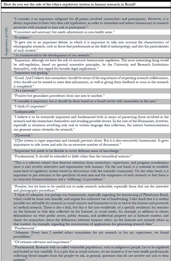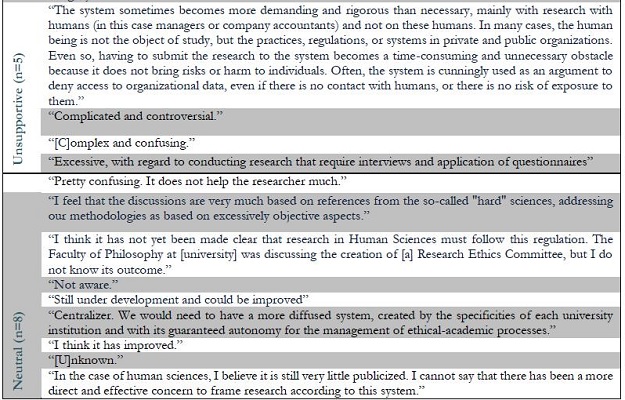One factor that is consistent with a relatively new ethics regulatory framework for research involving humans in HSS in Brazil is that the (2) views of the CEP/CONEP System among the coordinators surveyed are not mature. Some of these respondents demonstrate that learning about the ethics review System is a gap to be filled. Respondent #39 states that “I think it has not yet been made clear that research in Human Sciences must follow this regulation. The Faculty of [field omitted] was discussing the creation of a Research Ethics Committee, but I don’t know about the outcome.”. This self-report is aligned with that from Respondent #2: “… Research with so-called vulnerable populations, such as indigenous people, has to be regulated and looked at very carefully. It is a pity that in social sciences, we are treated as if we were health professionals collecting blood samples from the people we ask, in general, questions that do not involve any risk to their integrity.”.
