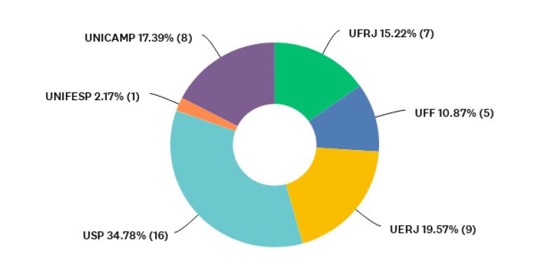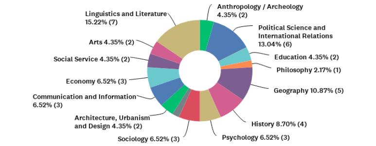 For an overview of participants’ institutions represented through their graduate programs, Figure 1 shows the percentages for each university, and Figure 2 shows the distribution of graduate programs’ main fields represented by the coordinators (n= 46), according to the assessment areas of CAPES. Most coordinators who participated in our research were serving their programs in this capacity for one to five years (n=31; 67%). Half of respondents declared that they had already served as coordinators or vice-coordinators before taking that position at the time of the survey.