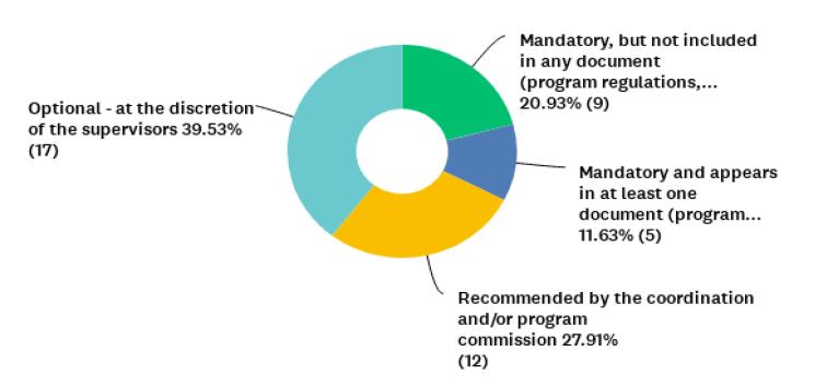 Other coordinators reported that there was no recommendation, as can be seen in Figure 3. Respondent #26 is among the 21% (n=9) of respondents reporting that submission to the System was “Mandatory, but not included in any document (program regulations, selection notice, defense requirements or others) of the graduate program”, as also shown in Figure 3. This respondent reported that the program he/she coordinated did not deem it necessary to make such a recommendation in any specific document, as it was assumed that researchers were expected to follow the principles of the national regulatory framework [CEP/CONEP System] for the ethical conduct of human-subject research.