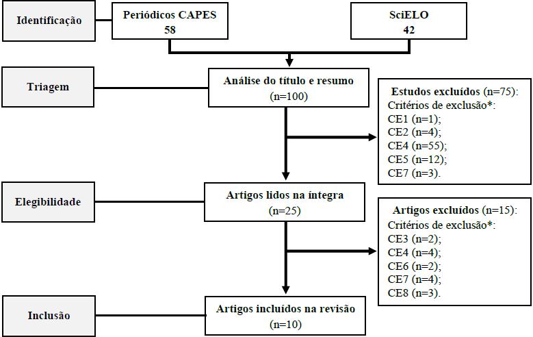 Conforme o Quadro 1, foram identificadas 100 produções. Após a triagem (leitura dos títulos e resumo), 75 foram excluídas e 25 elegíveis para leitura na íntegra, em que os dados foram coletados e organizados em matrizes de sínteses elaboradas no Microsoft Word 2013 (na terceira fase). Após a leitura na íntegra, a amostragem final resultou em dez artigos. A Figura 1 ilustra o processo de seleção dos estudos a partir do fluxograma baseado na recomendação do documento Preferred Reporting Items for Systematic Review and Meta-Analyses (PRISMA) (Moher et al., 2015).