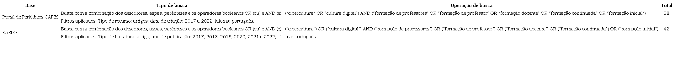 Para efetivação da busca, “cultura digital”, “formação de professores” e respectivas variações (cibercultura, formação de professor, formação docente, formação inicial e formação continuada) foram definidos como descritores. As bases de dados possuem mecanismos que contribuem para o refinamento dos estudos conforme critérios estabelecidos, reduzindo o número da amostragem inicial e agilizando a análise dos revisores. O Quadro 1 sintetiza como a busca foi realizada em cada base.