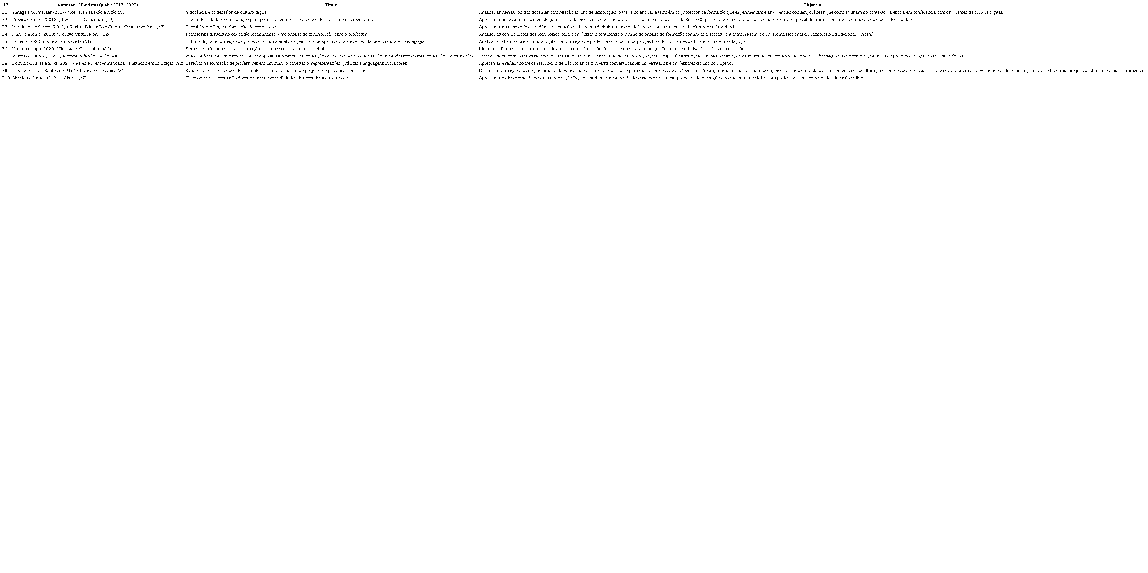 O Quadro 2 lista os artigos incluídos na revisão integrativa, respectivos autores, periódicos e classificação Qualis/CAPES (2017-2020), título e objetivo. Os estudos receberam uma identificação (IE) pela junção da letra “E” com um numeral cardinal (E1, E2... E10) para fins de organização dos resultados a serem expostos no Quadro 3 e no Quadro 4.