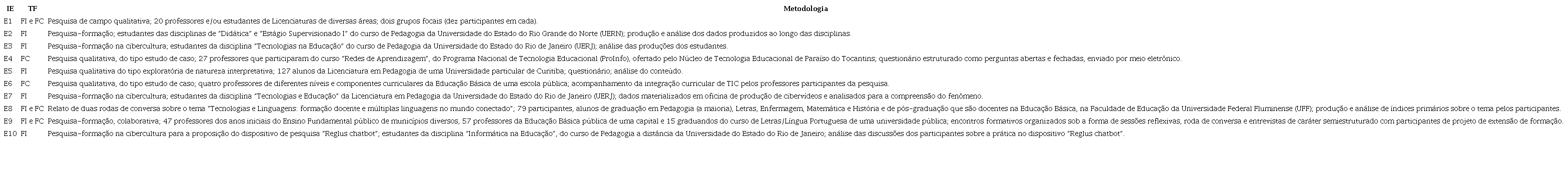 O Quadro 3 apresenta os aspectos metodológicos dos estudos incluídos. A partir do destaque dado a tais aspectos, amplia-se a compreensão dos contextos em que as pesquisas foram desenvolvidas, situando revisores e leitores quanto ao campo empírico. Dessa forma, apresenta o tipo de formação (TF) considerado no artigo: formação inicial (FI) e/ou continuada (FC); e a metodologia adotada: tipo de pesquisa, participantes, campo empírico, instrumentos de coleta/produção de dados e/ou técnica de análise dos dados.