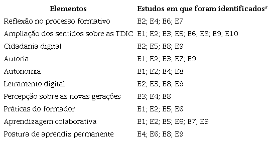 O Quadro 4 apresenta os elementos constituintes da formação de professores para a cultura digital, em perspectivas diferentes da visão instrumental, e respectivos estudos em que foram identificados por meio do processo de análise da revisão.
