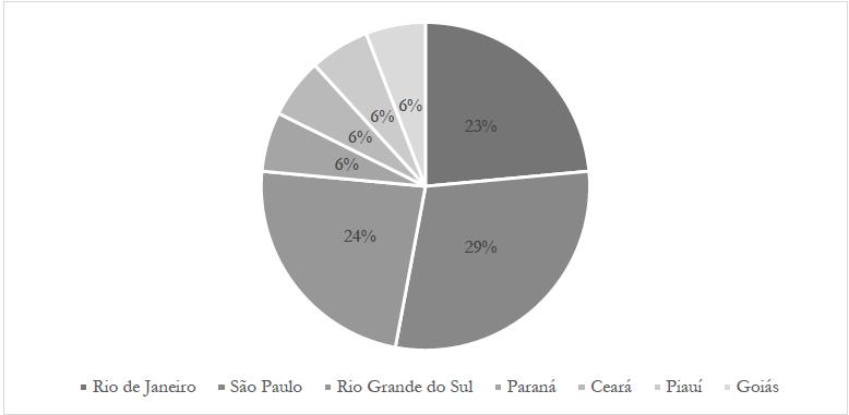 Os trabalhos selecionados - Bach (2021), Batista (2021), Carvalho (2020), Chingulo (2021), Fernandes (2020), Ferreira (2021), Guadagnino (2021), Lagoeiro (2019), Leal (2020), Lima (2020), Menezes (2021), Monteiro (2020), Moreira (2019), Robert (2021), Silva (2020), Vieira (2021) e Xavier (2020) - encontram-se nas áreas da Educação, Geografia e História. Eles são trabalhos de universidades do Rio de Janeiro (23%), Paraná (6%), Ceará (6%), Rio Grande do Sul (24%), São Paulo (29%), Piauí (6%) e Goiás (6%), conforme demonstrado no Gráfico 1.