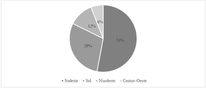 Conforme o Gráfico 2, 53% dos trabalhos encontrados encontram-se na região Sudeste, 29% na região Sul, 12% na região Nordeste e 6% na região Centro-Oeste. Neste trabalho, não foram encontradas pesquisas na região Norte do país.