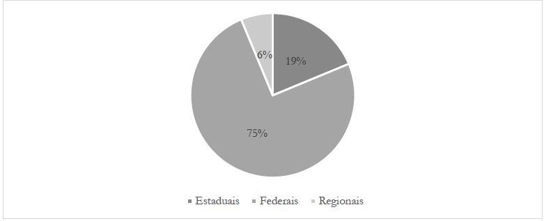 A maioria das pesquisas, 94%, são de universidades públicas e somente uma é de universidade privada, conforme ilustra o Gráfico 3. Entre as públicas, 75% são de universidades federais, 19% são de universidades estaduais e 6% são de universidades regionais, conforme ilustra o Gráfico 4.