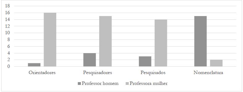 A orientação de 16 trabalhos, 94%, foi feita por mulheres doutoras e somente um trabalho, 6%, foi orientado por um homem doutor. A predominância feminina também foi vista na autoria dos trabalhos, conforme mostra o Gráfico 5, 13 deles, 76%, foram escritos por mulheres, e quatro deles, 24%, são de autoria de homens. Em suas pesquisas, as autoras pesquisaram, na grande maioria, professoras mulheres. Entretanto, nos títulos e nos resumos, elas são representadas pela nomenclatura “professor” e “professores” no gênero masculino. Apenas nos trabalhos de Monteiro (2020) e Fernandes (2020), aparece “professora” no gênero feminino e em nenhum trabalho aparecem os dois gêneros da palavra “professor(a)”. Muitos autores utilizaram a palavra “docente” e “pedagogo”.