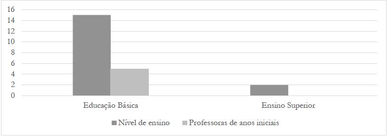 A maioria desses trabalhos são específicos da área do Doutorado e do Mestrado em Educação, mais especificadamente 14 deles: Bach (2021); Batista (2021); Carvalho (2020); Chingulo (2021); Fernandes (2020); Ferreira (2021); Guadagnino (2021); Lagoeiro (2019); Leal (2020); Lima (2020); Monteiro (2020); Robert (2021); Vieira (2021); Xavier (2020). Conforme mostra o Gráfico 6, dos 17 trabalhos, 15 se referem a professoras da Educação Básica: Bach (2021); Batista (2021); Carvalho (2020); Fernandes (2020); Ferreira (2021); Guadagnino (2021); Lagoeiro (2019); Leal (2020); Lima (2020); Menezes (2021); Monteiro (2020); Moreira (2019); Robert (2021); Silva (2020); Xavier (2020). Já o restante dos trabalhos, dois deles, referem-se a professoras do Ensino Superior: Chingulo (2021) e Vieira (2021). Dos trabalhos sobre a Educação Básica, somente os trabalhos de Fernandes (2020), Lagoeiro (2019), Leal (2020), Lima (2020) e Monteiro (2020) dirigem-se especificadamente às professoras dos anos iniciais do Ensino Fundamental, trazendo todos eles como metodologia de pesquisa as narrativas professorais.
