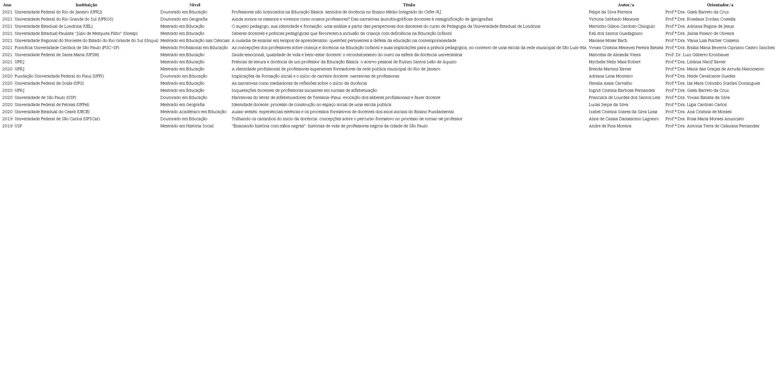 Além das pesquisas narrativas com o enfoque nas professoras dos anos iniciais, há também as pesquisas sobre a docência em outros níveis da Educação Básica e Educação Superior. As pesquisas que mais se aproximam das investigações de Leal (2020), Monteiro (2020) Fernandes (2020), Lima (2020) e Lagoeiro (2019), as quais foram explanadas anteriormente, são as pesquisas de Xavier (2020), Carvalho (2020), Silva (2020) e Chingulo (2021). Os três primeiros autores abordam a identidade profissional e a formação das professoras e o último autor focaliza nas professoras iniciantes.