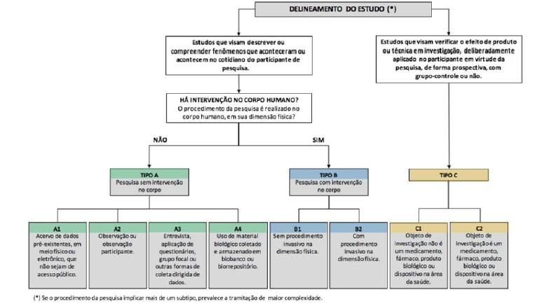 Enquanto transcorre o debate sobre as especificidades das pesquisas nas áreas relacionadas às CHS e a necessidade de um modelo coerente com elas, seguem também as discussões e regulações no âmbito do Sistema CEP/Conep. Em 2022, em consideração ao disposto no item XIII.6 da Resolução CNS n° 466/2012 (BRASIL, 2013), e no art. 21 da Resolução CNS nº 510/2016 (BRASIL, 2016), foi exarada a Resolução nº 674/2022 (BRASIL, 2022), a qual trata da tipificação da pesquisa (Figura 1) e da tramitação dos protocolos de pesquisa no Sistema CEP/Conep.