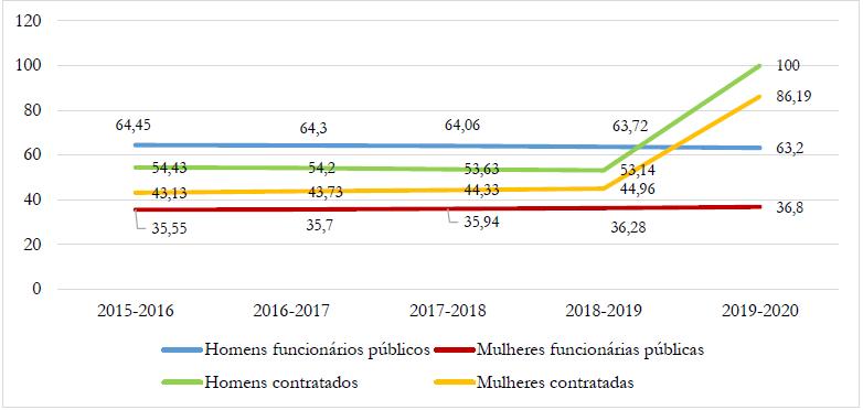 Conforme mostrado na Figura 1, para o ano de 2019-2020, podemos observar que as mulheres ao longo de sua carreira profissional permanecem ativas e ocupam categorias de trabalho estáveis.