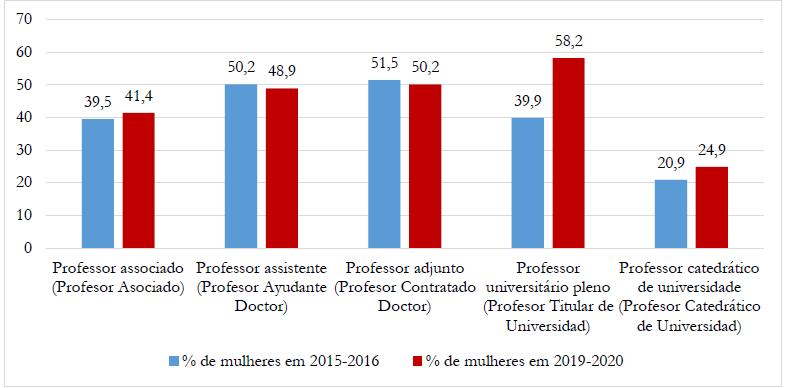 A Figura 2 mostra que a percentagem de professores de ensino e pesquisa do sexo feminino, na categoria de Professor Titular, excede a proporção de homens até 2020. Essa é uma das transformações mais importantes nos dois períodos analisados, de 39,9% em 2015-2016 para 58,2% em 2020. No entanto, na última categoría (Professor Universitário), os números se invertem, representando apenas 24,9%.
