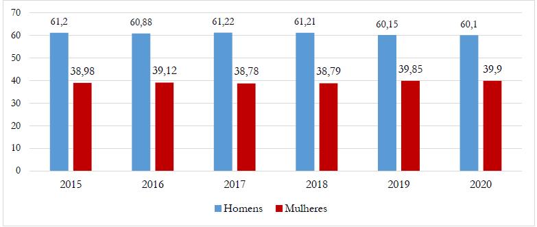 A Figura 3 mostra a evolução desse último indicador para os anos de 2015 a 2020 (em todos os anos, as mulheres não ultrapassam 40%). Devemos observar que a paridade é uma meta incluída na Agenda 2030 (especificamente 9.5), daí a proposta de aumentar a pesquisa científica e melhorar a capacidade tecnológica.