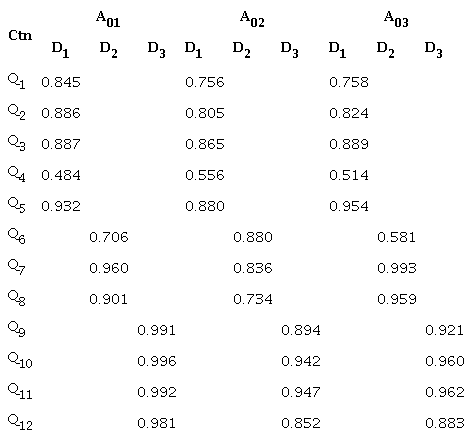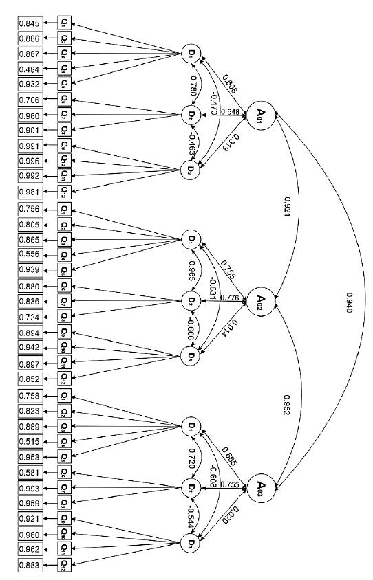 El análisis factorial confirmatorio (AFC) fue realizado para corroborar la relación entre las preguntas (Qi) y las dimensiones (Di) de los diferentes períodos (A01, A02 y A03). Se procedió a realizar la estimación de máxima verosimilitud para permitir la estructura factorial más adecuada para las 12 preguntas (Q) del test. La Figura 6 muestra valores coeficientes consistentes de las dimensiones con los criterios empíricos.