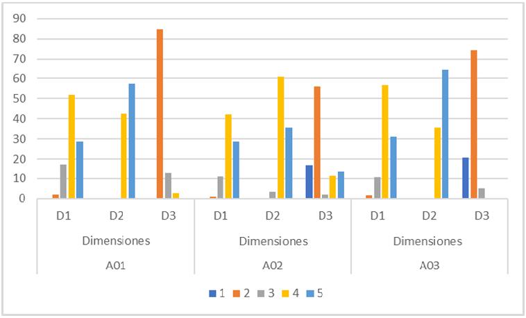Para las valoraciones promedios de mayor porcentaje, en la dimensión D1 el 59.4±10.5 % para el período A01, el 65.4±10.9 %, para el período A02 y el 70.2±11.6 % para el período A03 consideran para las escalas (4 y 5). En la D2 el 75.1±4.6 % para el período A01, el 58.5±6.5 % para el período A02 y el 75.0±7.9 % para A03, consideran para las escalas (4 y 5). En la D3 el 75.1±4.6 %, para el período A01, el 73.5±2.5 % para el período A02 y el 74.2±8.5 % para el A03 consideran la escala (2).