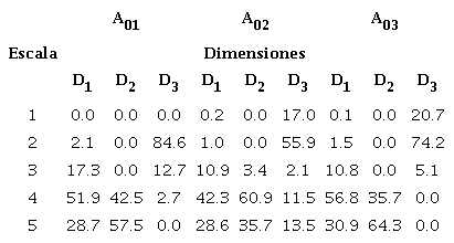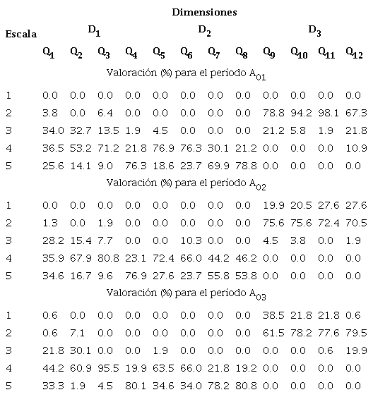 La Figura 2 y la Tabla 5 muestran los resultados de las valoraciones globales para las diferentes dimensiones en estudio en los diferentes períodos. Para el período A01 en la D1 la valoración mayor se da en la escala 4 y 5 con una valoración de 51.9 y 28,7 % respectivamente. Para la D2 la valoración mayor se da en la escala 5 y 4 con una valoración de 57.5 y 42.5 % respectivamente. Para la D3 las valoraciones mayores se dan en la escala 2 y 3 con valores de 84.6 y 12.7 % respectivamente.